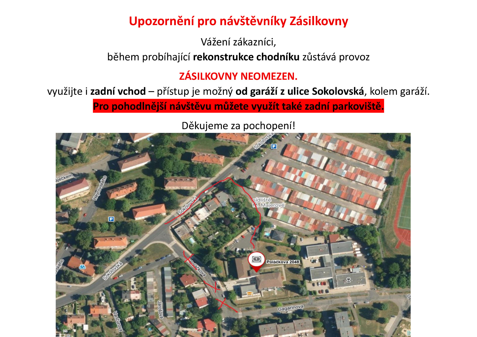 PO DOBU REKONSTRUKCE ULICE A CHODNÍKŮ JE ZÁSILKOVNA V PROVOZU,